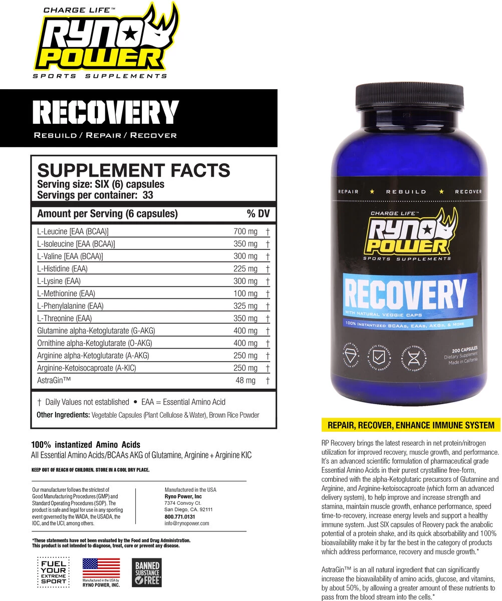 Get back in the game faster with Recovery, the most comprehensive blend of high quality Amino Acids available. Containing the 12 most important amino acids instantized for immediate use, this unique formula is designed to stonewall the breakdown of muscle tissue and delay physical and mental fatigue. Pharmaceutical grade essential amino acids and nitrogen transporters provide faster recovery times, increase energy, and reinforce the immune system.
