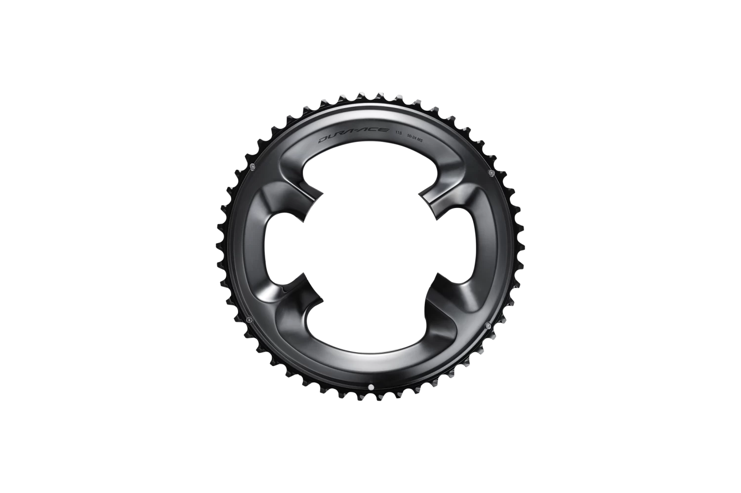 The Shimano R9100 series crankset achieves the ultimate in optimal power transfer. It does this through a more reinforced outer chainring on its unique asymmetrical four-arm spider construction.