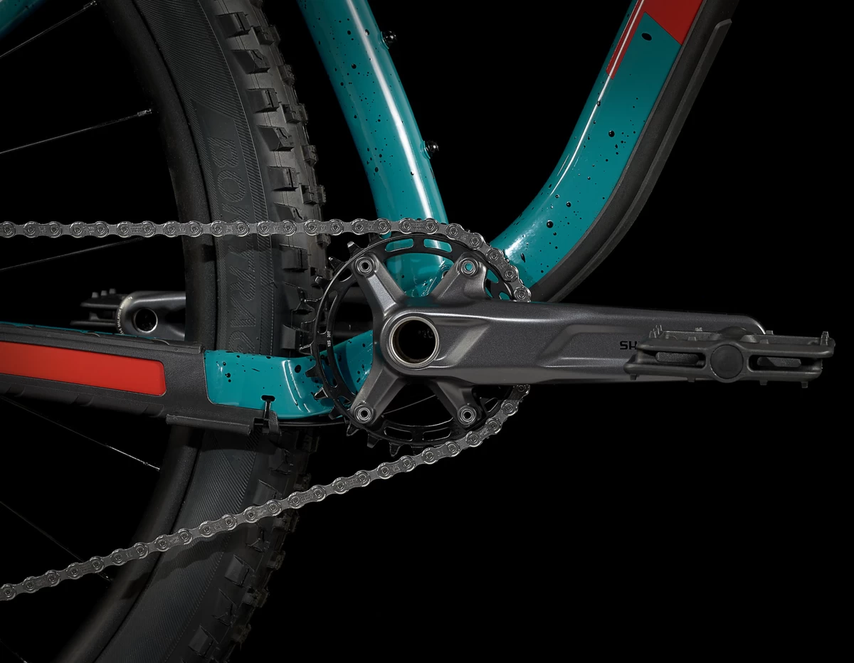 A lightweight aluminum frame, fast-rolling 29er wheels, wide and grippy 2.6″ tires, and a 140mm RockShox Recon fork with a lockout. It’s equipped with a reliable Shimano 1×12 drivetrain with a wide range of gears for climbing, powerful hydraulic disc brakes, and a dropper post for room to get low on descents, corners, and jumps.