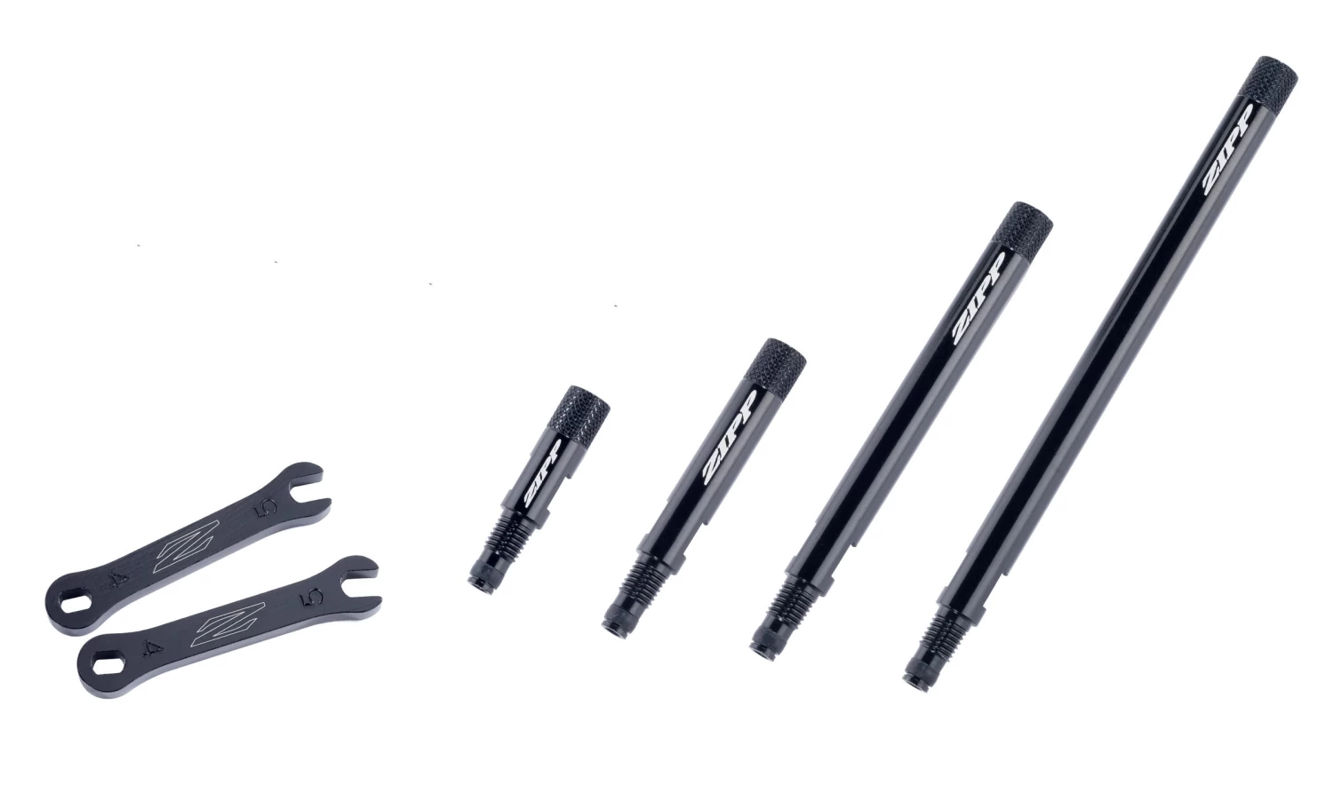 Works with Zipp butyl inner tubes with a removable core as well as other leading tubular tires and inner tubes that have removable cores. Available as a kit (3 extenders and 2 wrenches) or individually.
